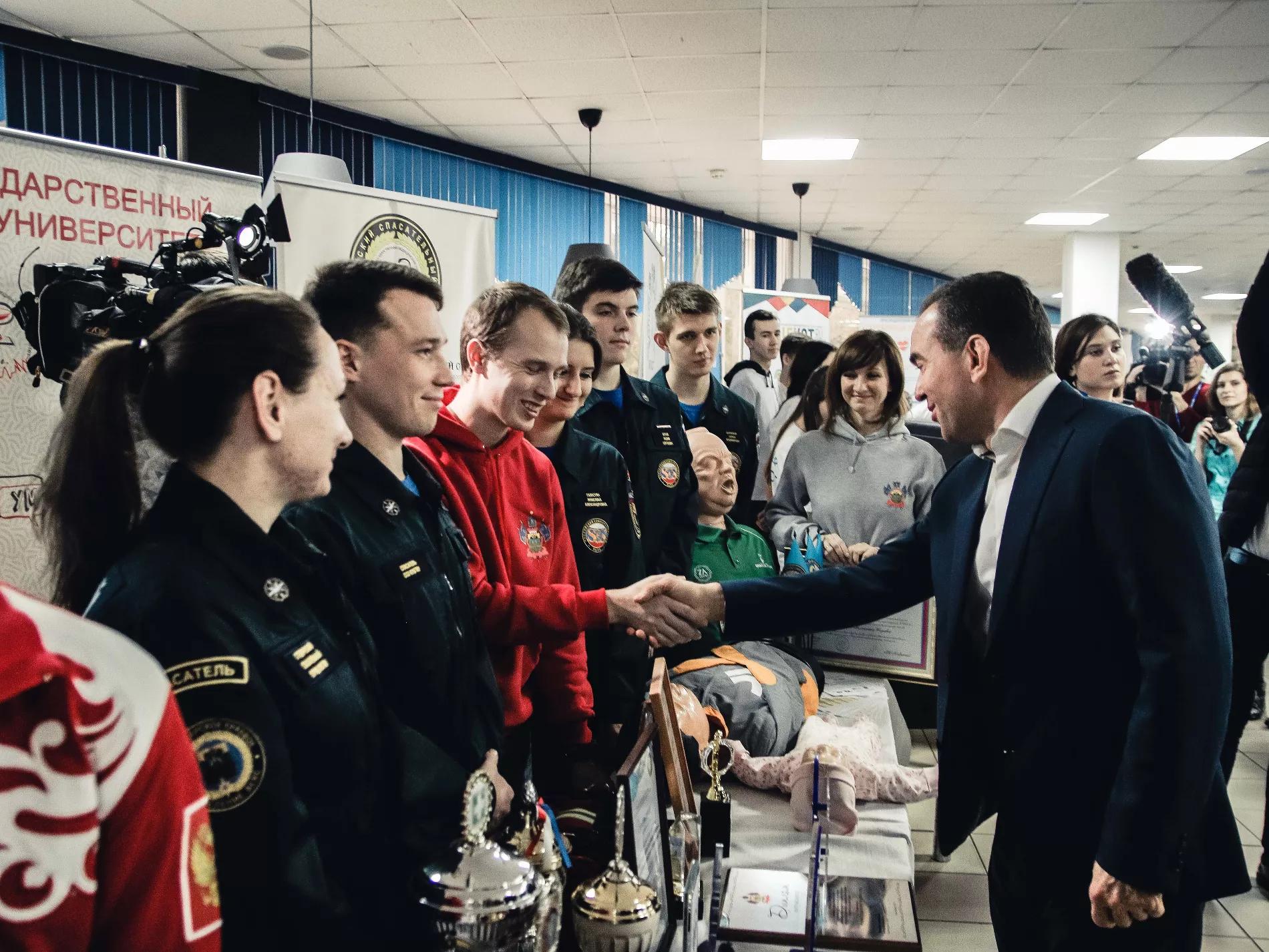 Поздравить волонтеров пришли губернатор Краснодарского края Вениамин Кондратьев, а также ректоры ведущих вузов Краснодарского края, среди них руководитель КубГМУ Сергей Алексеенко.