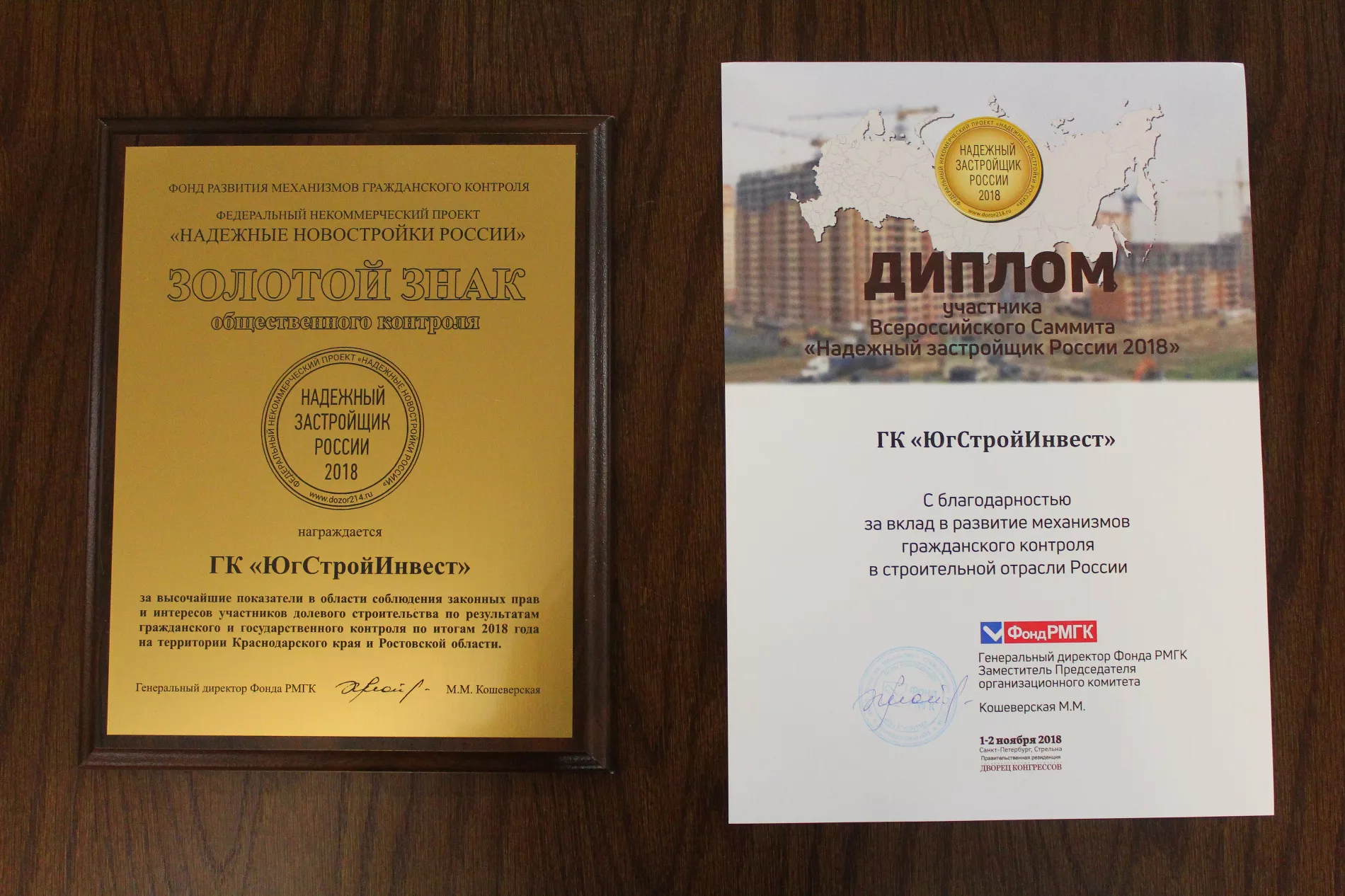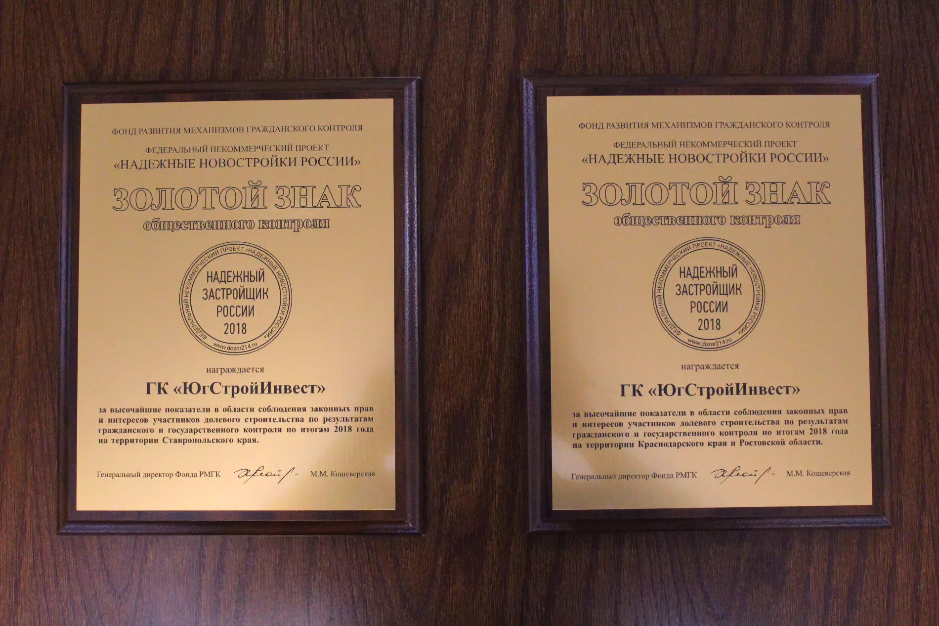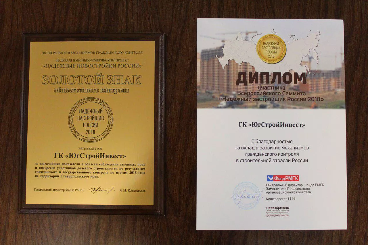 Группа компаний «ЮгСтройИнвест» прошла подготовку, которая длилась в течение года. Фонд Развития механизмов гражданского контроля проверил более 15 тыс. строящихся жилых комплексов по всей стране. ЮСИ стал одной из трех строительных компаний России, которая получила два золотых знака «Надежный застройщик России».