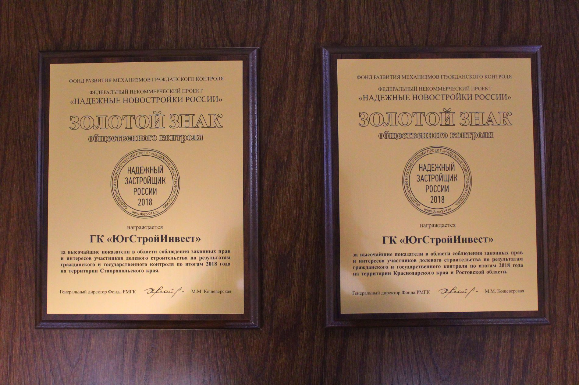 Группа компаний «ЮгСтройИнвест» прошла подготовку, которая длилась в течение года. Фонд Развития механизмов гражданского контроля проверил более 15 тыс. строящихся жилых комплексов по всей стране. ЮСИ стал одной из трех строительных компаний России, которая получила два золотых знака «Надежный застройщик России».