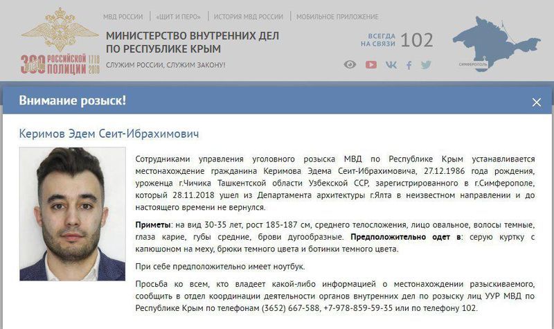 В пресс-службе МВД по Крыму сообщили, что Керимов 28 ноября ушел с работы в неизвестном направлении и пропал. Заявление об исчезновении мужчины написал его отец.