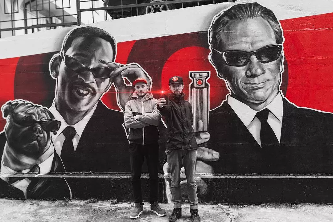 На новых граффити, которые появились в январе, художники из Витебска Ян Кузьмин и Глеб Каштанов изобразили агентов Кей и Джей с нейтрализатором — устройством для стирания памяти.