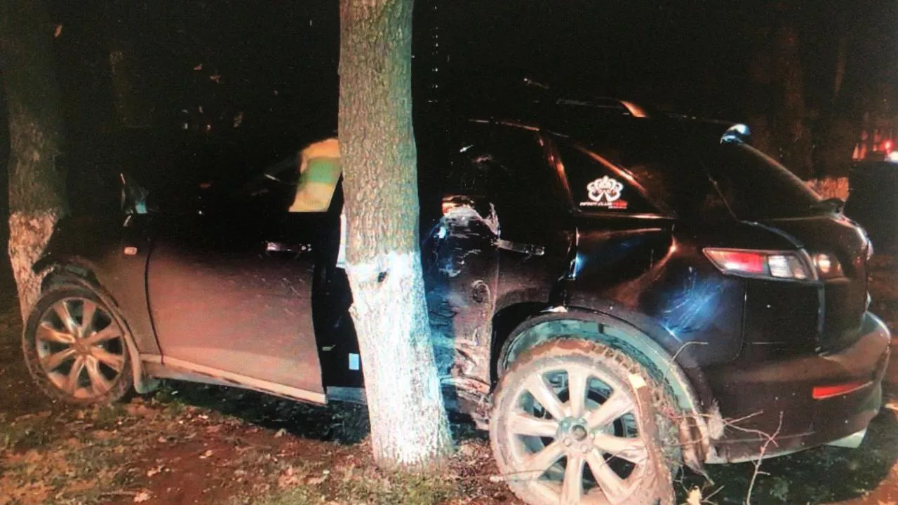 Авария произошла около 3:00 на улице Героев-Разведчиков. По предварительным данным, водитель Infiniti превысил скорость, не справился с управлением и наехал на бордюр. После этого машину отбросило на пешеходное ограждение и она врезалась в дерево.