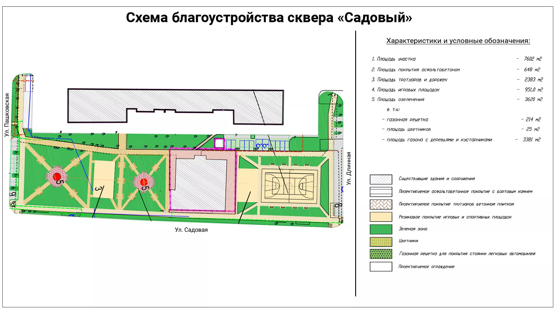 Сквер «Садовый» расположится на площади 0,7 га вдоль трамвайных путей на улице Садовой между Пашковской и Длинной. На участке хотят сделать многоуровневое озеленение, сохранить существующие деревья, сформировать газоны и клумбы, построить спортплощадку и сделать дополнительные парковочные места.