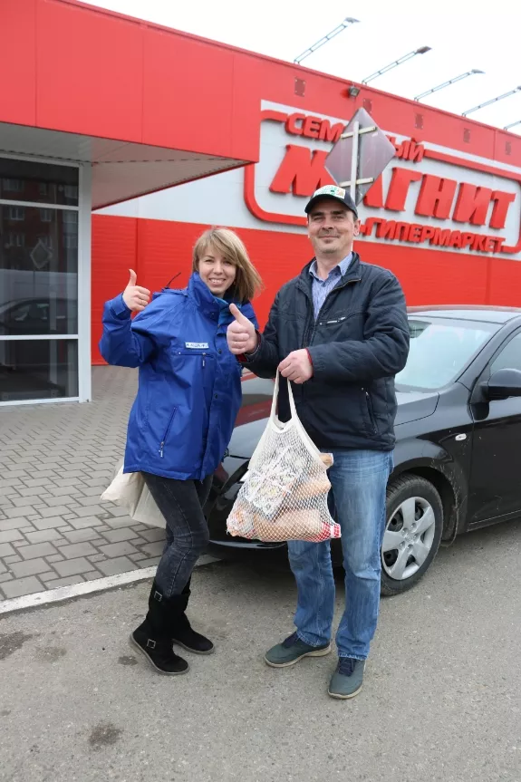 Перед продовольственным гипермаркетом экологи провели опросы покупателей и раздали им авоськи, а также дали полезные рекомендации по сохранению экологии.