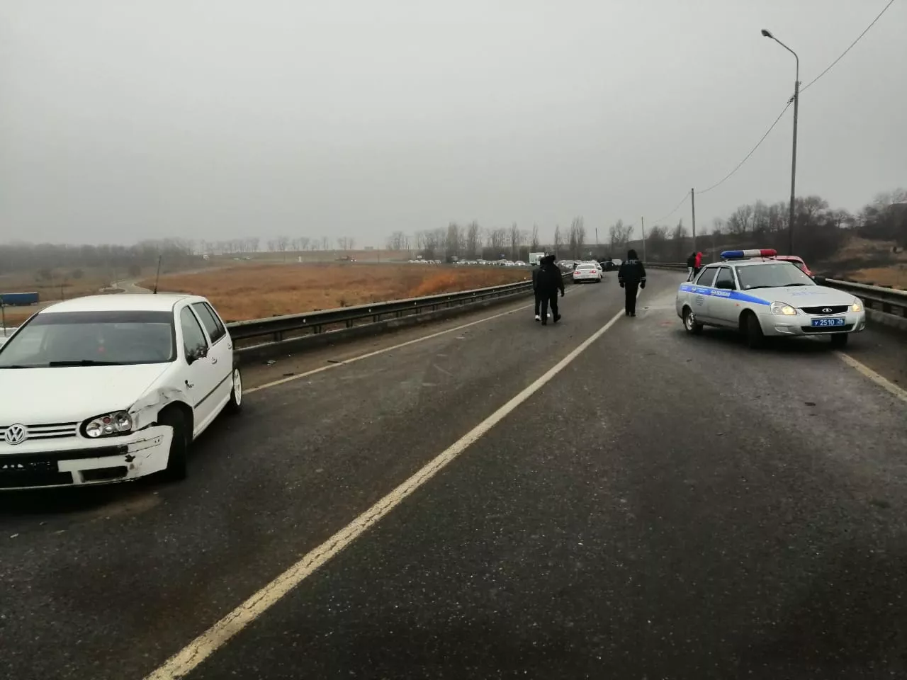 ДТП произошло около 7:30 на подъезде к Черкесску. По предварительным данным, женщина за рулем автомобиля Volkswagen Golf не справилась с управлением, выехала на встречку и врезалась в черный ВАЗ-2112 и Ford Focus. После этого отечественную легковушку отбросило на серебристый ВАЗ-2112.