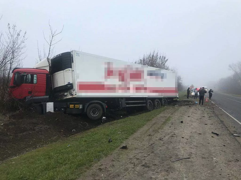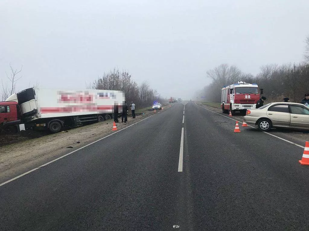 Авария произошла около 8:00 на трассе М29 «Кавказ». По предварительным данным, 39-летний мужчина за рулем Kia Spectra во время обгона выехал на встречную полосу и врезался в фуру MAN с полуприцепом.