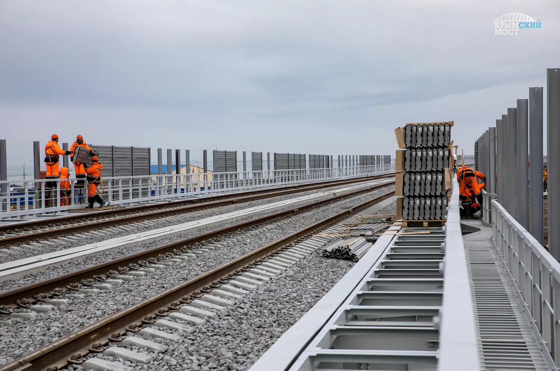 Строители в феврале начали устанавливать на железнодорожной части Крымского моста акустические экраны и стойки освещения