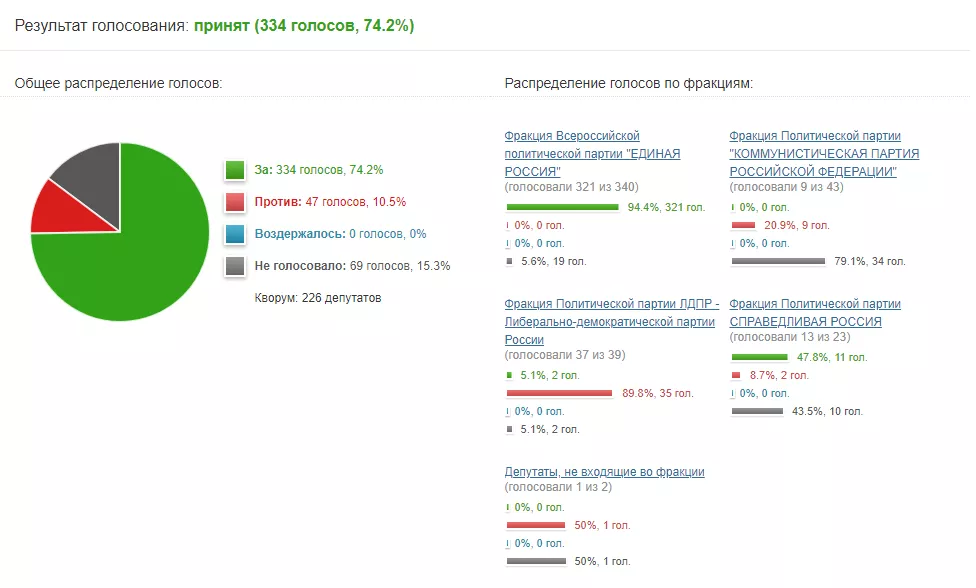 Законопроект «О внесении изменений в некоторые законодательные акты Российской Федерации» (в части обеспечения безопасного и устойчивого функционирования сети интернет на территории Российской Федерации) прошел первое чтение — за него проголосовали 334 депутата (74,2%). Против выступили 47 депутатов (10,5%), не голосовали 69 человек (15,3%). Никто не воздержался от голосования.