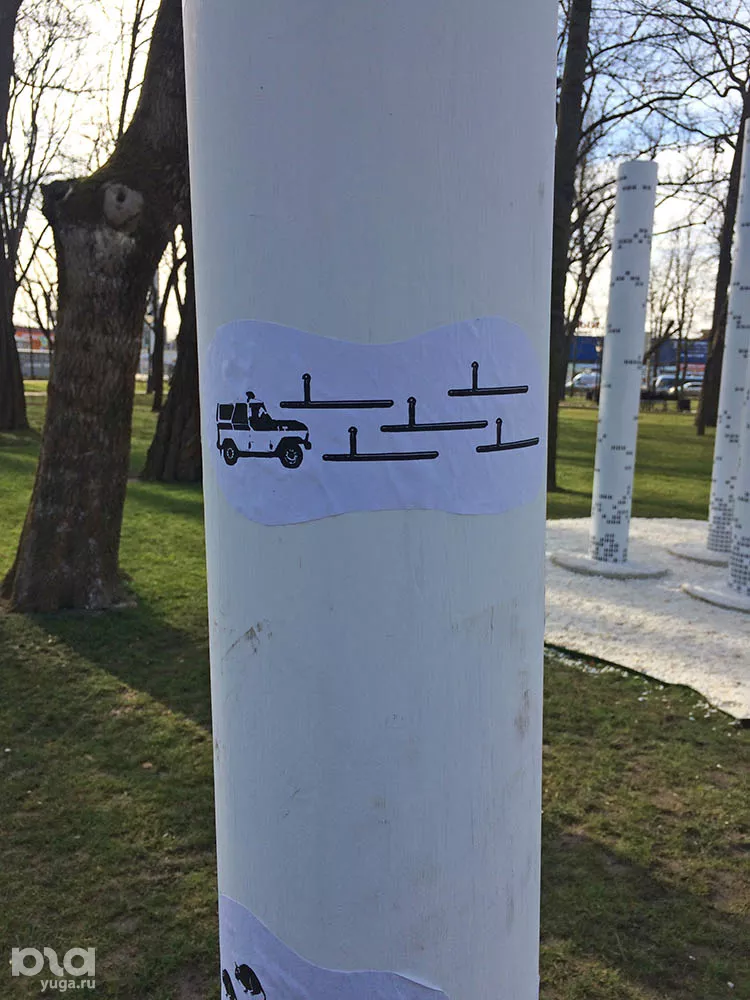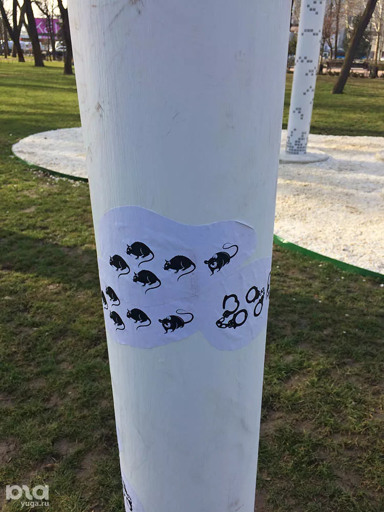 Неизвестные в ночь на 5 марта установили новый столп с наклейками возле скульптуры в Вишняковском сквере Краснодара, открытой неделю назад