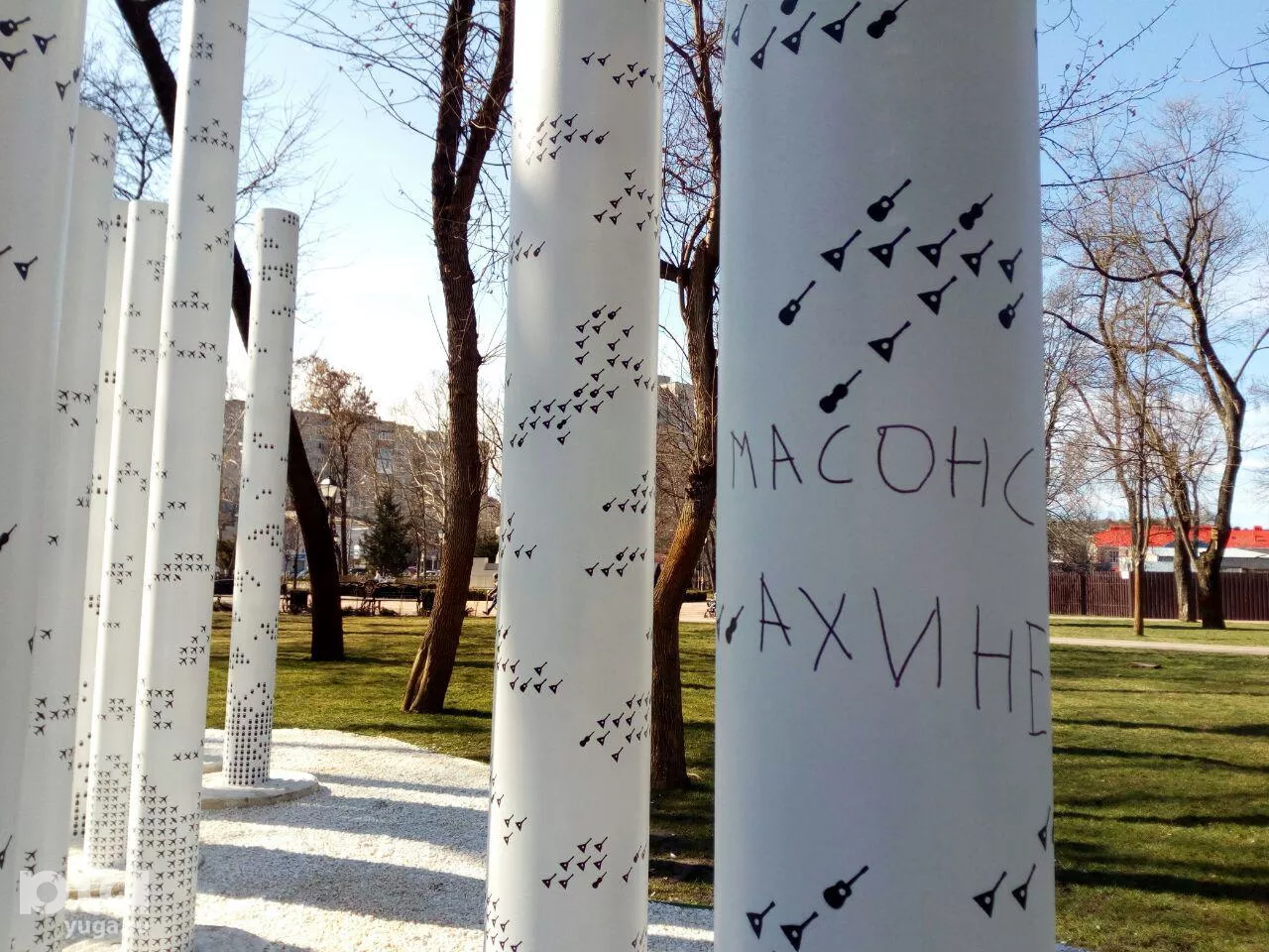 Утром 27 февраля на церемонии открытия арт-объекта автор скульптуры Виктор Линский сообщил порталу Юга.ру о задержании двух молодых парней, которые наносили надписи «ЕДОДОЙ» на деревья рядом со скульптурой «Столпы».