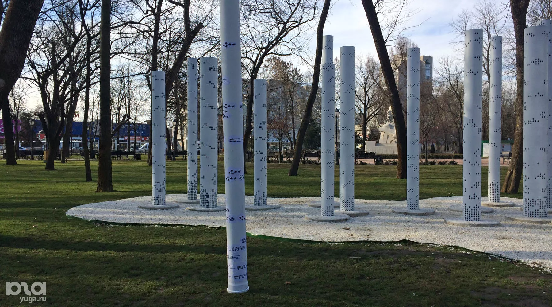 Как сообщали Юга.ру, 27 февраля в Вишняковском сквере открыли современную скульптуру авторства Виктора Линского «Столпы». Арт-объект состоит из 21 стального столба высотой от 3 до 4,5 метров, стилизованного под березы с изображением балалаек, матрешек, бутылок, ракет и самолетов.