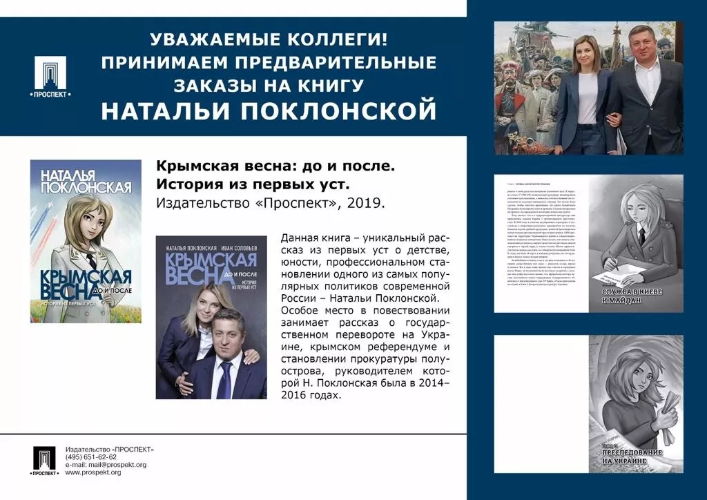 Поклонская провела презентации 10 марта в Крыму и 12 марта — в Москве. На них присутствовал ее муж, бывший руководитель аппарата уполномоченного по правам человека в РФ Иван Соловьев.