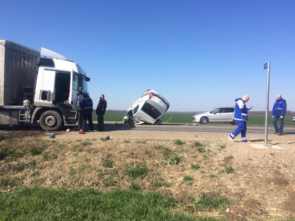 Авария произошла в 14:00 на трассе Краснодар — Кропоткин — граница Ставропольского края. По предварительным данным, 21-летний парень за рулем автомобиля Renault SR выехал на встречную полосу и врезался в грузовик Mercedes-Benz Actros с полуприцепом.