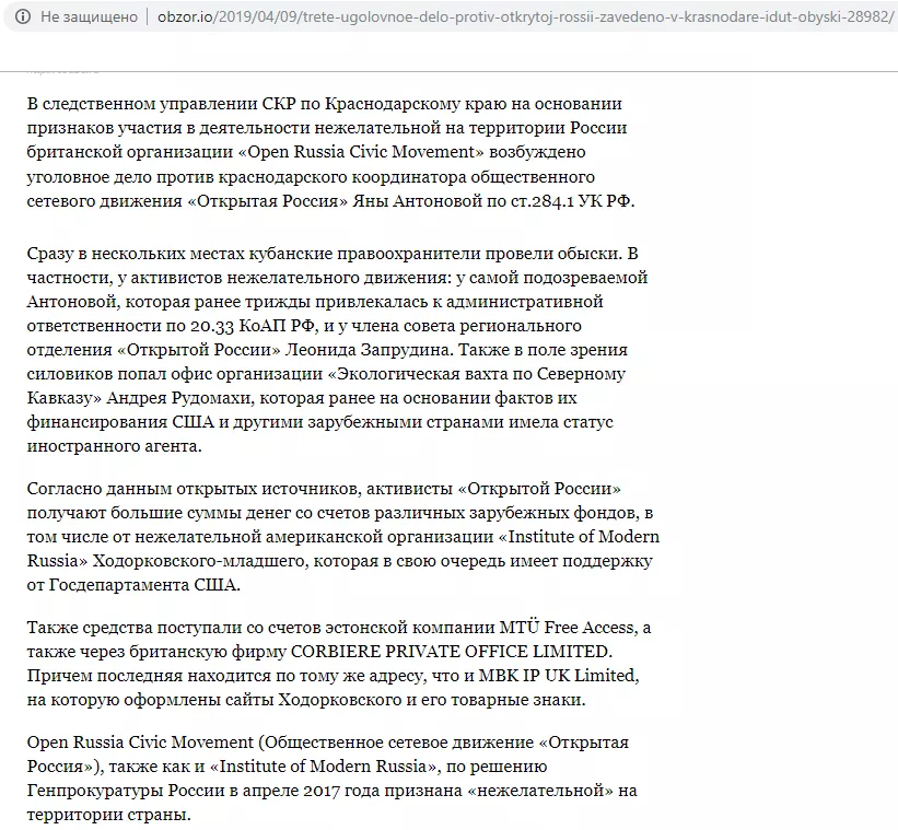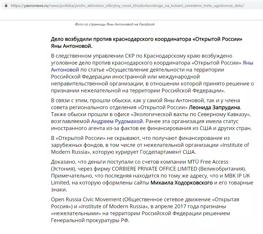 На странице «Открытая Россия // Краснодарский край» в свою очередь была ссылка на ресурс, который заблокирован в РФ по решению органов госвласти, так как в 2017 году Генпрокуратура признала организацию нежелательной. В ведомстве тогда говорили, что решение касается только британской организации «Открытая Россия» и на работе движения в России не отразится.