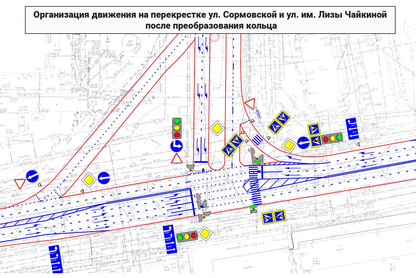 На пересечении Сормовской и Лизы Чайкиной вместо кольца сделают Т-образный перекресток. При движении по Лизы Чайкиной водители смогут с двух полос поворачивать налево — на Сормовскую. Также можно будет повернуть направо с улицы Лизы Чайкиной на Сормовскую и с Сормовской — на Лизы Чайкиной.
