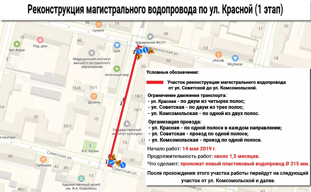 Ремонтные работы начнутся 14 мая. Заменять водопровод будут поэтапно: для этого Красную разделят на семь участков от Пушкина до Буденного — в среднем по два квартала на участок. На первом из них, от улицы Пушкина до Комсомольской, хотят успеть закончить за полтора месяца, после чего перейти на следующий этап.