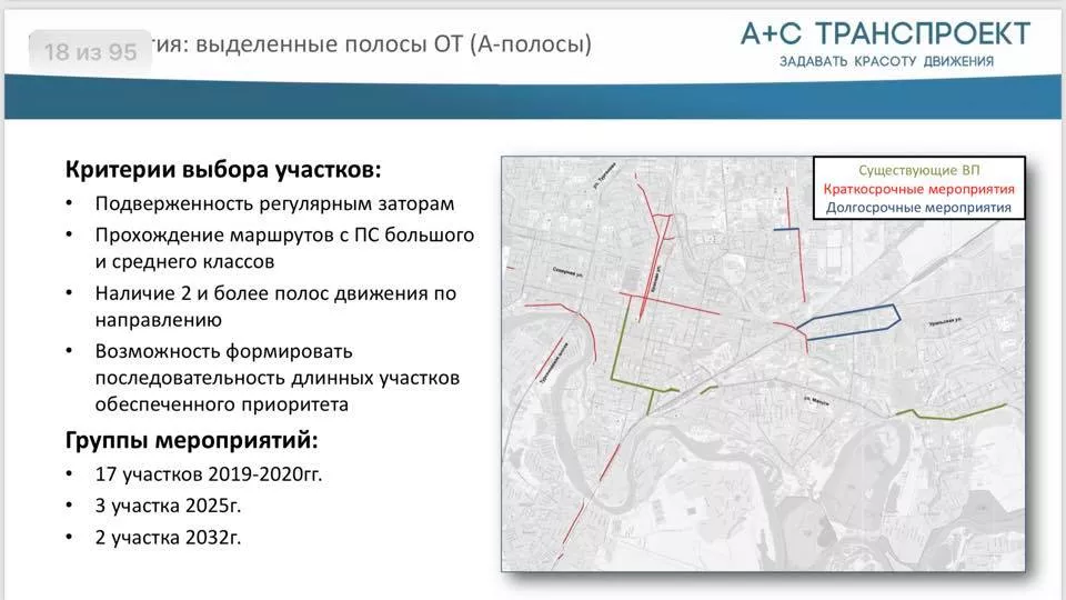По словам помощника главы города, представители Высшей школы экономики рассказали, как необходимо отбирать участки для внедрения выделенных полос. Специалисты считают, что критериями отбора улиц должны быть: подверженность регулярным заторам, прохождение маршрутов с машинами большой вместимости, наличие двух и более полос движения по одному направлению, возможность формировать последовательность длинных участков. По мнению представителей ВШЭ, в 2019–2020 году необходимо сделать выделенные полосы на 17 участках, к 2025 году — еще на двух, к 2032-му — еще на трех.