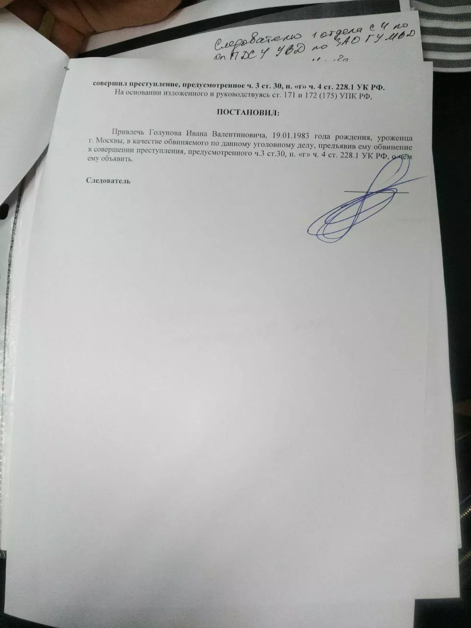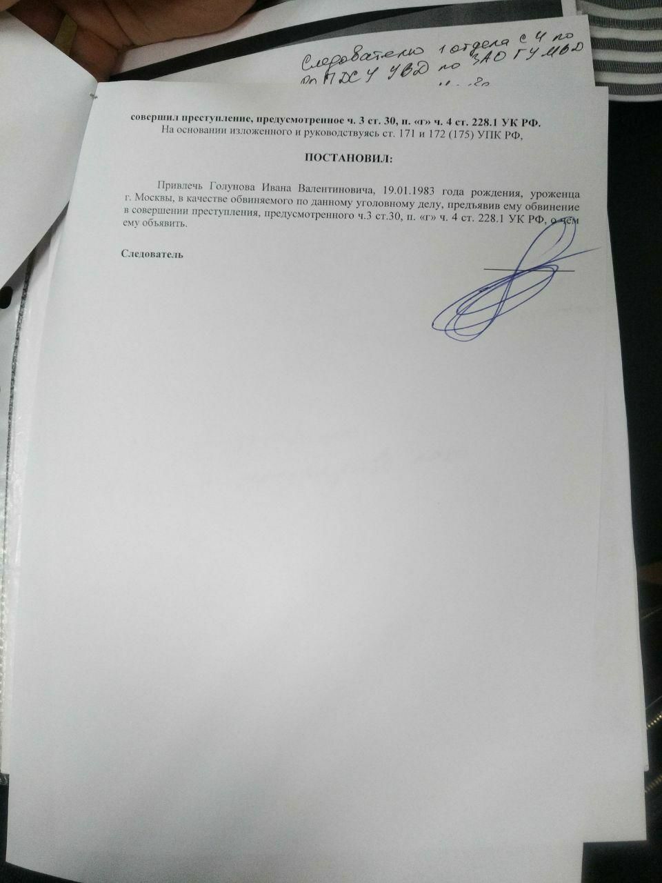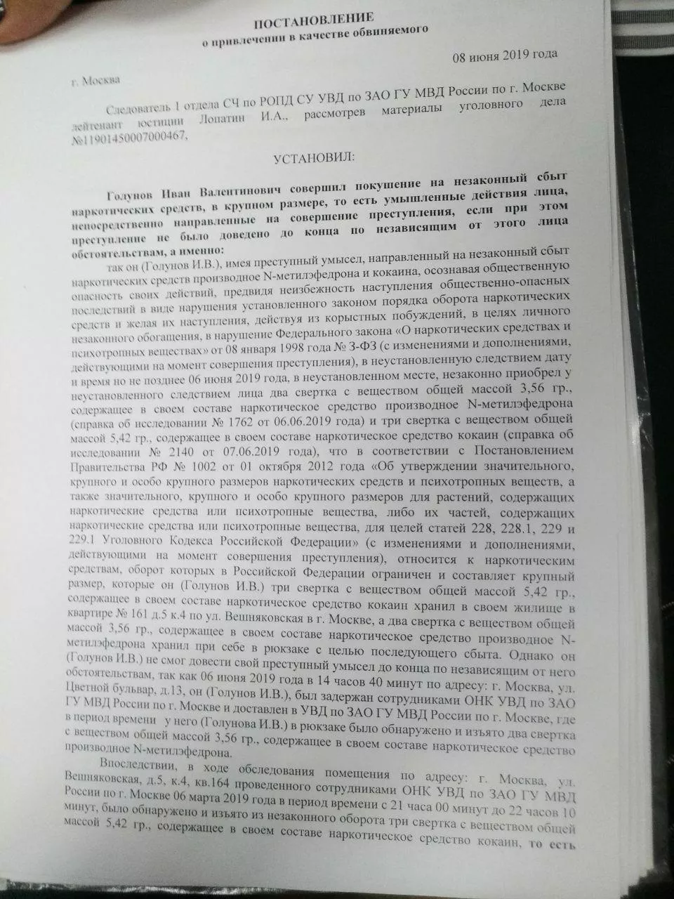 Фотографии постановления о привлечении в качестве обвиняемого в покушении на сбыт выложил в своем телеграм-канале адвокат Павел Чиков. В тексте говорится о том, что Иван Голунов якобы пытался сбыть наркотические вещества. Вещество определено как «производное N-метилэфедрона и кокаина». О якобы существующей связи с группировкой, занимающейся торговлей наркотиками, не упомянуто, никаких фактов и доказательств того, что Голунов покупал и намеревался продать вещества, также нет.