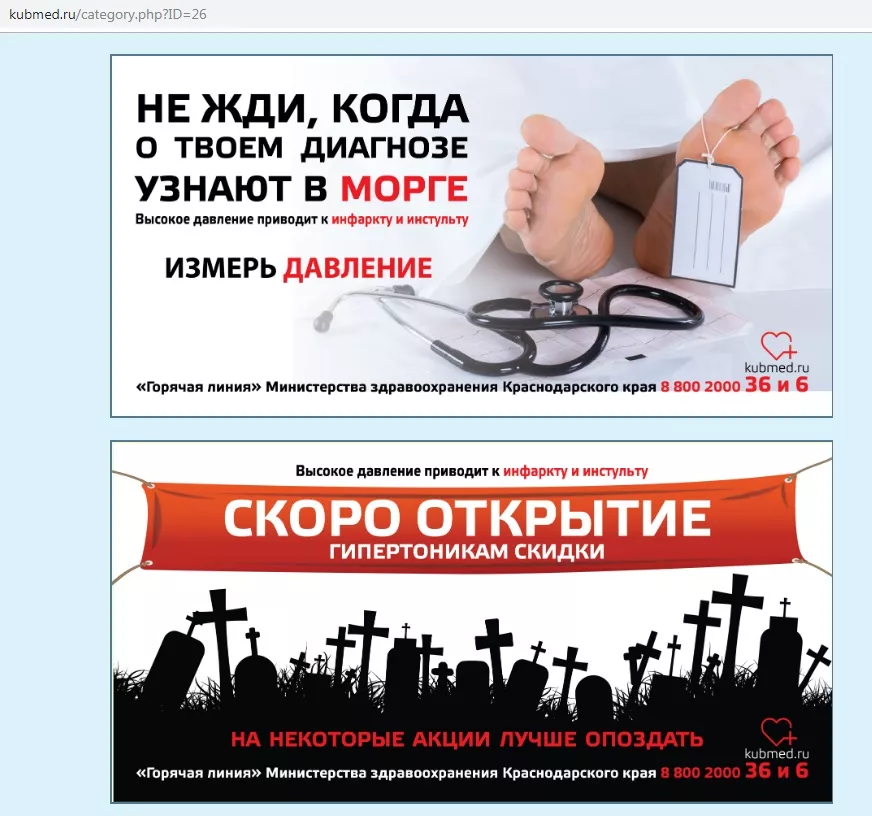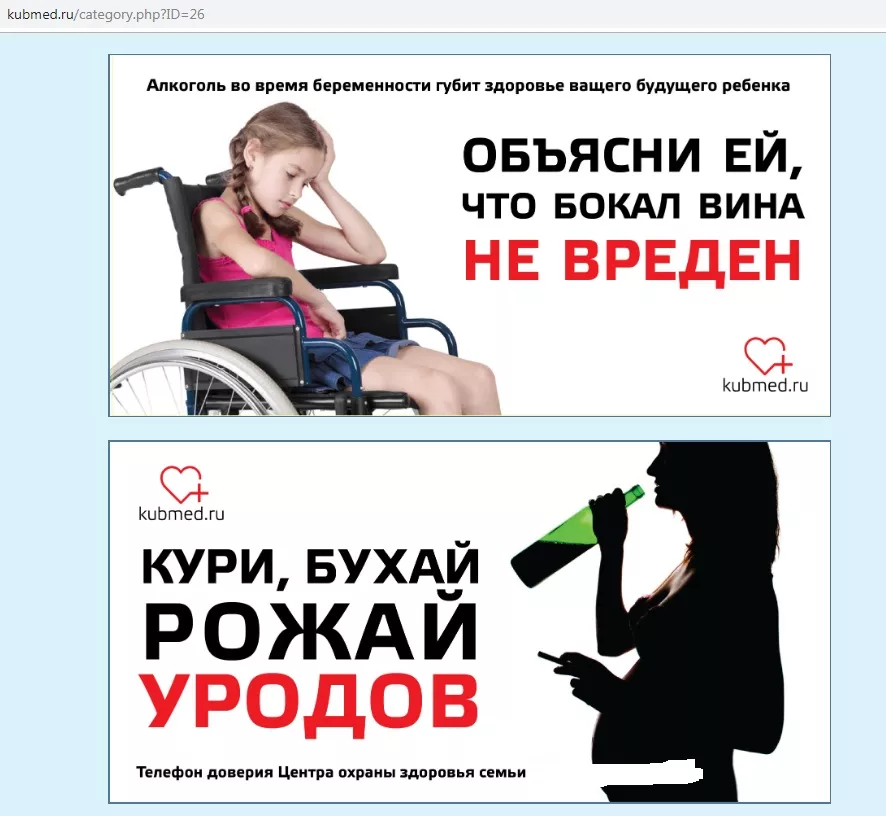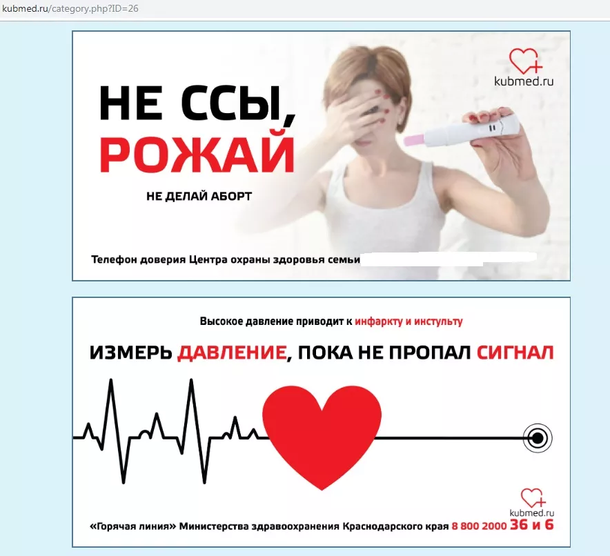 Ссылка на этот сайт указана на информационных стендах в городских поликлиниках Краснодара. В разделе «Социальная реклама: без лишних слов» были размещены графические изображения, призывающие не делать аборты, следить за своим давлением и весом, проходить вакцинацию, не пить. Однако все сопровождается специфическими картинками и фразами: «В Питере — пить, в Краснодаре — рожать», «Не ссы, рожай», «Не жди, когда о твоем диагнозе узнают в морге. Измерь давление», «Кури, бухай, рожай уродов», «Жирное не может быть здоровым», «Жирное сексуальным не бывает». На каждой картинке указывался номер горячей линии министерства здравоохранения Краснодарского края или телефон доверия Центра охраны здоровья семьи.