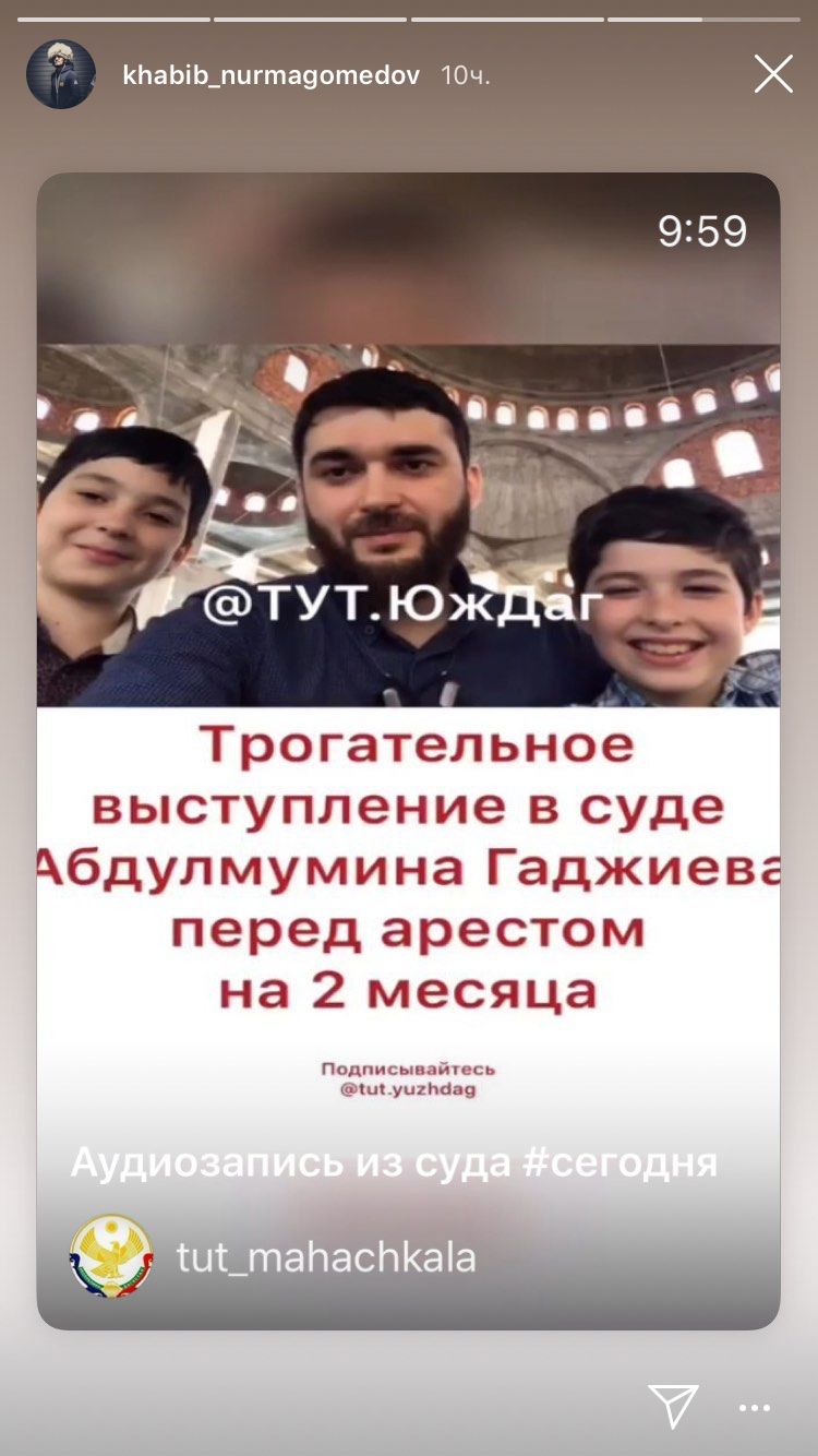 Чемпион UFC Хабиб Нурмагомедов сделал репост речи Гаджиева в сторис своего инстаграма.