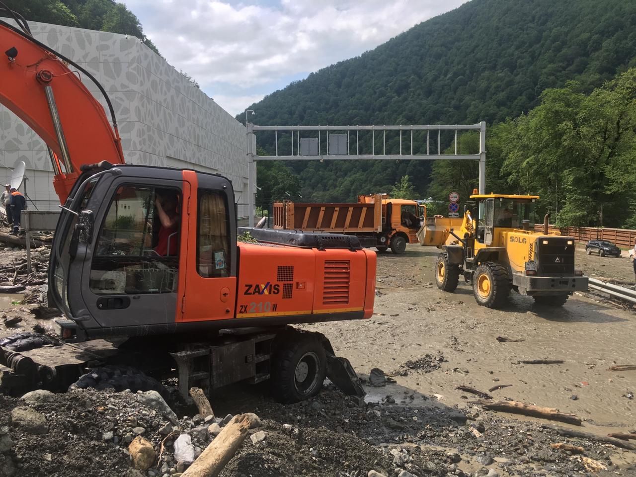 В Красной Поляне 25 июня расчистили одну полосу дорожного полотна для движения легкового транспорта в месте схода селевого потока
