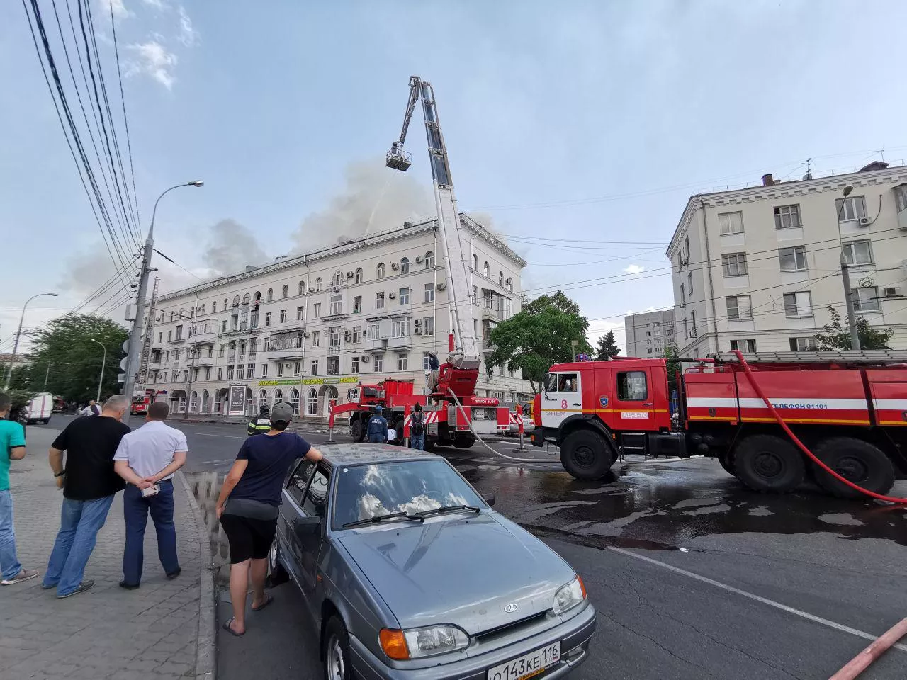 Возле вокзала Краснодар-I в полдень 4 июля загорелась пятиэтажка. К 14:50 огонь распространился на площади 1,6 тыс. кв. метров. Из дома эвакуировали около 70 человек.