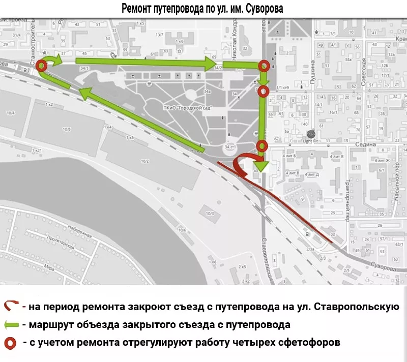 На время ремонта в ночь с 15 на 16 июня рабочие закрыли съезд с моста на улицу Ставропольскую при движении из города. Его откроют после завершения работ. На участке разработали альтернативную схему движения: нужно свернуть с улицы Суворова на Захарова, затем на Постовую и по ней выехать на Ставропольскую.