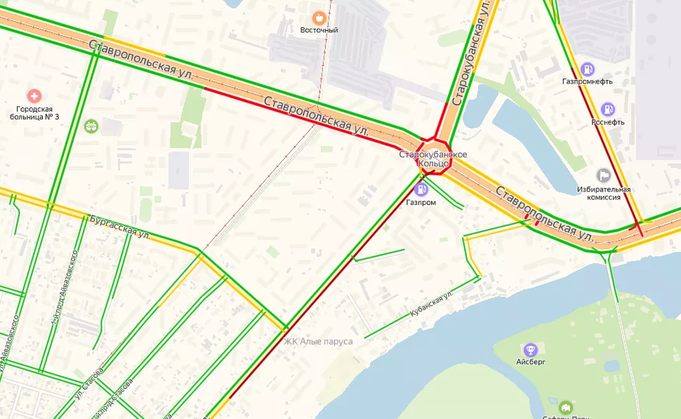 По данным сервиса «Яндекс.Пробки» на 17:50, движение по кольцу плотное. Наиболее загружена улица Старокубанская перед кольцом в сторону Селезнева и Старопольская в сторону Кубанской. Машины там едут со скоростью 3-5 км/ч.