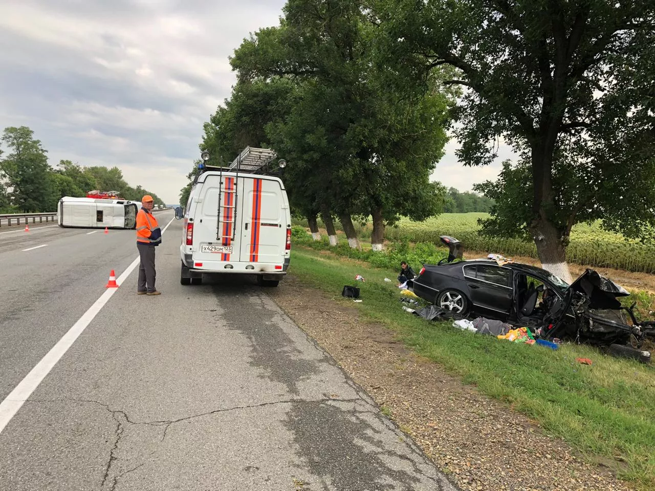 Авария случилась около 5:00 на трассе «Кавказ». По предварительным данным, водитель автомобиля Volkswagen Passat не выдержал безопасную дистанцию и столкнулся с попутной машиной ГАЗель. После удара фургон опрокинулся на бок, а легковушка съехала в кювет.