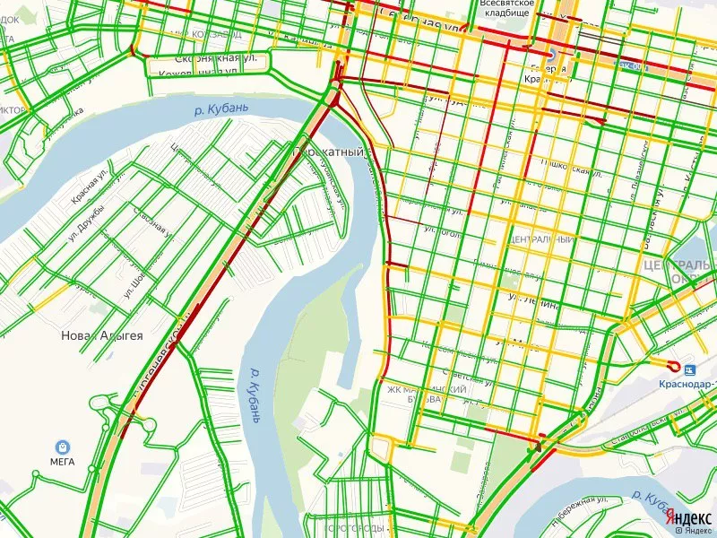 К 17:00 пробка на Тургеневском шоссе оценивалась в десять баллов. Также вечером десятибальные заторы были на улице Кубанская набережная и Тургенева. В 20:15 загруженность на Тургеневском мосту стала меньше — восемь баллов.