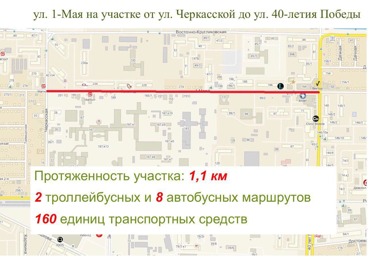 На улице 1-го Мая от Черкасской до 40 лет Победы ходят восемь автобусных и один троллейбусный маршруты. Каждый день на участке курсируют 160 единиц общественного транспорта. За счет выделения полосы движения по каждому маршруту удастся ввести еще один оборотный рейс, сэкономив в течение дня до 70 минут времени, сообщили в пресс-службе администрации Краснодара.