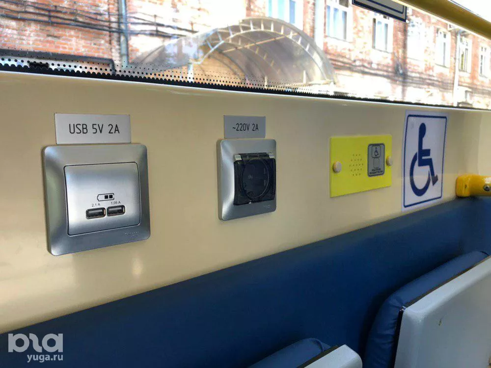 В вагоне предусмотрено автоматическое объявление остановок по ГЛОНАСС-координатам. Под потолком на средней площадке установлены специальные мониторы, где в режиме реального времени появляется информация о местоположении трамвая и данные о ближайших остановках. Эта система при необходимости позволит оповещать пассажиров о чрезвычайных ситуациях, сообщили в пресс-службе администрации Краснодара.