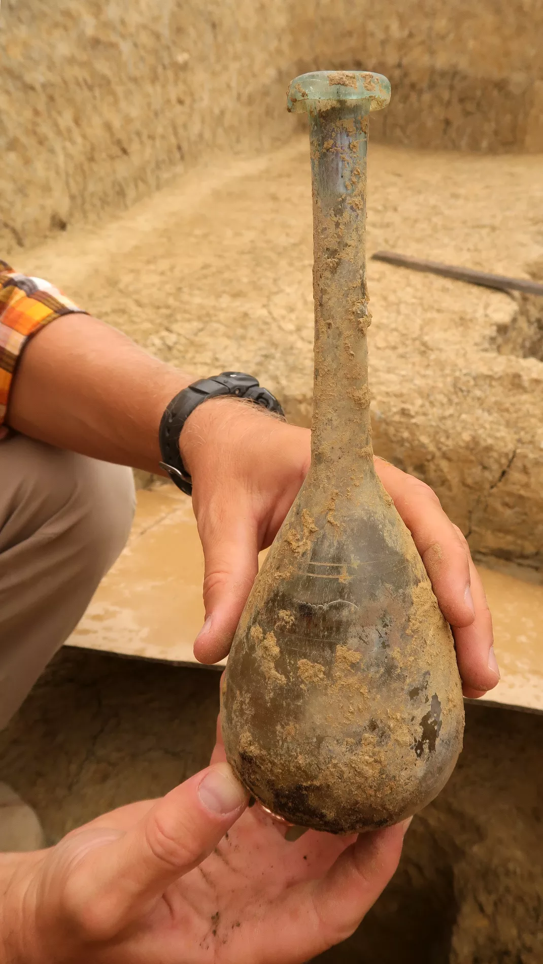 Плотно закупоренный стеклянный сосуд в воинском саркофаге археологи обнаружили в конце полевого сезона 2018 года. Он был наполнен соленой жидкостью, причем концентрация соли в ней оказалась выше, чем у морской воды Таманского залива, на берегу которого располагалась Фанагория.