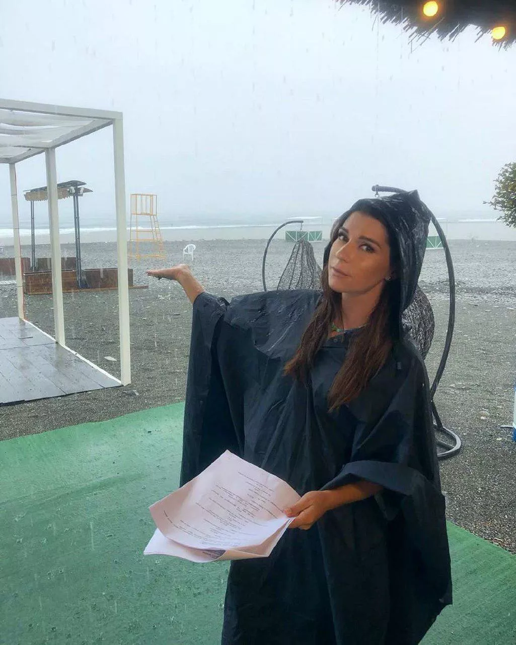 «Если Воронины снимают на натуре, начинается дождь, где бы ни высаживалась наша экспедиция. И он все льет и льет, доводя до нервного тика всю съемочную группу. Благо, с нами прилетели и сценаристы, которые переписали сценарий на месте, и можем снимать даже в таких условиях», — написала актриса.