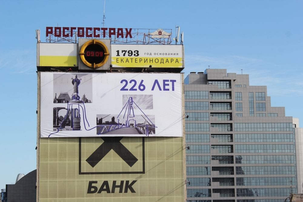 В Краснодаре на «здании с часами» напротив мэрии в сентябре начали вешать баннер к 226-летию города