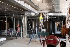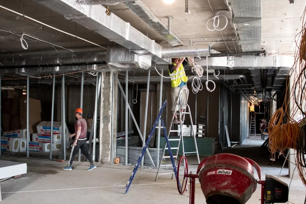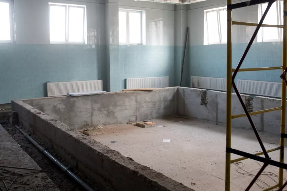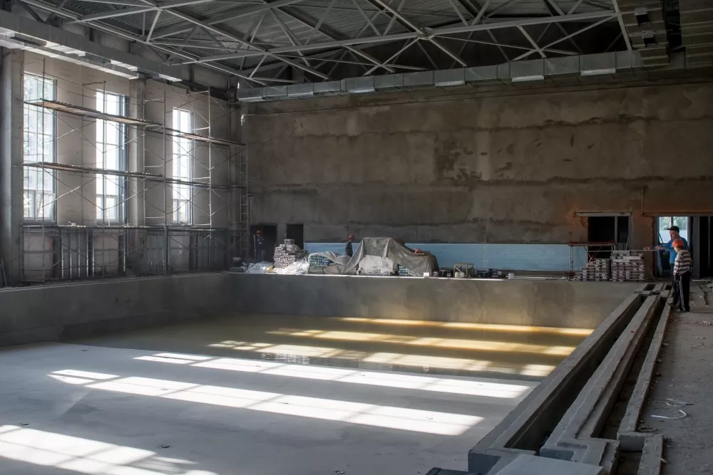 Стяжку пола закончили на 80%, рабочие уже начали укладывать керамогранит. Скоро в бассейне начнется внутренняя отделка и монтаж систем вентиляции, рассказали 25 сентября в пресс-службе мэрии города.