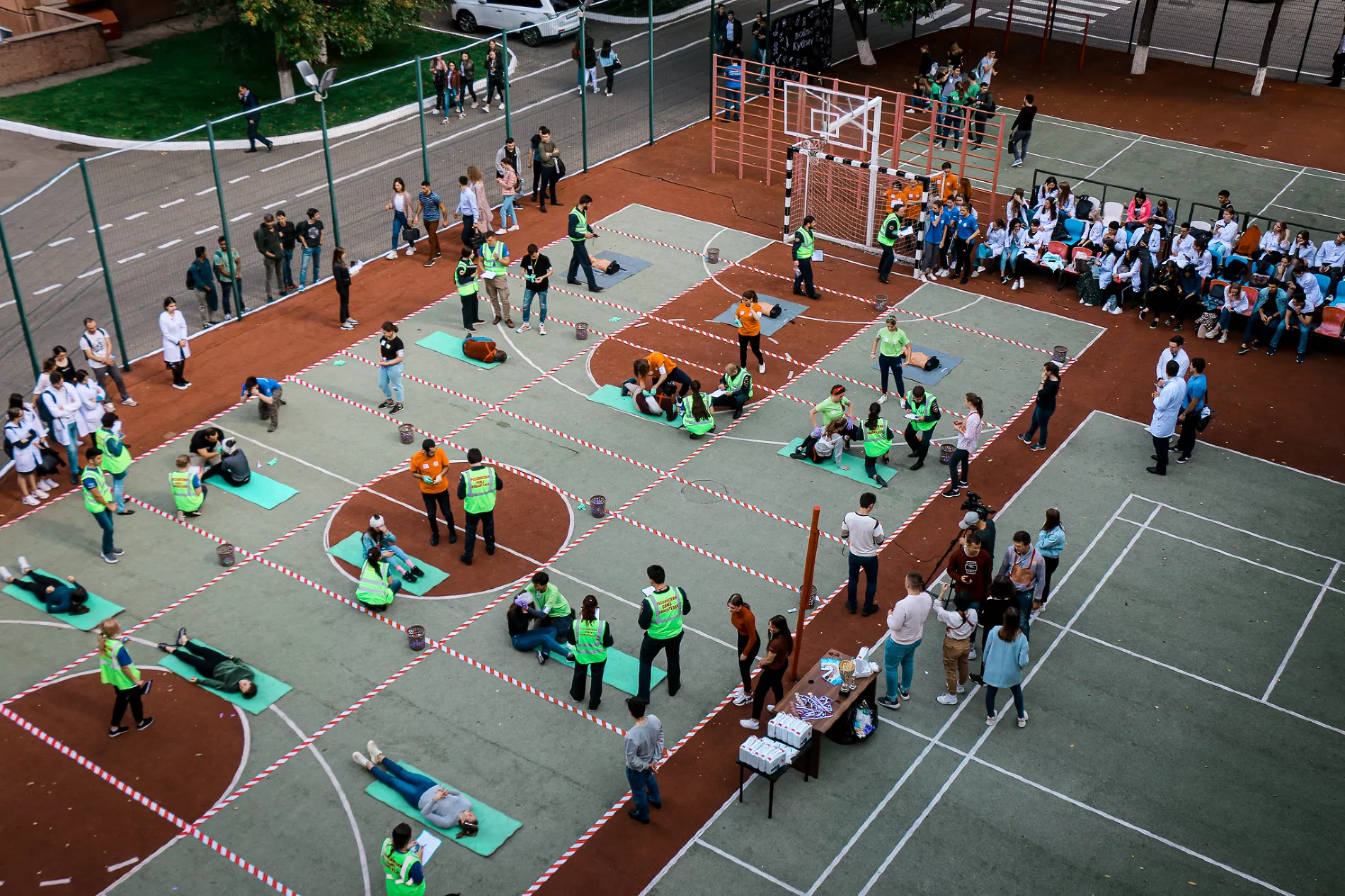 Всего было 15 команд, в составе которых — более 100 студентов университета. Командам надо было пройти три этапа. Первый этап содержал 30 вопросов по первой помощи и поддержке пострадавших. Второй этап — демонстрация навыков первой помощи: участники накладывали повязки при различных видах кровотечения и проводили сердечно-легочную реанимацию на специальном манекене, индикаторы которого показывали правильность выполнения.