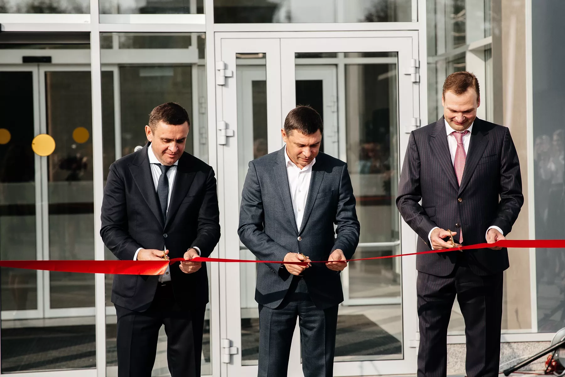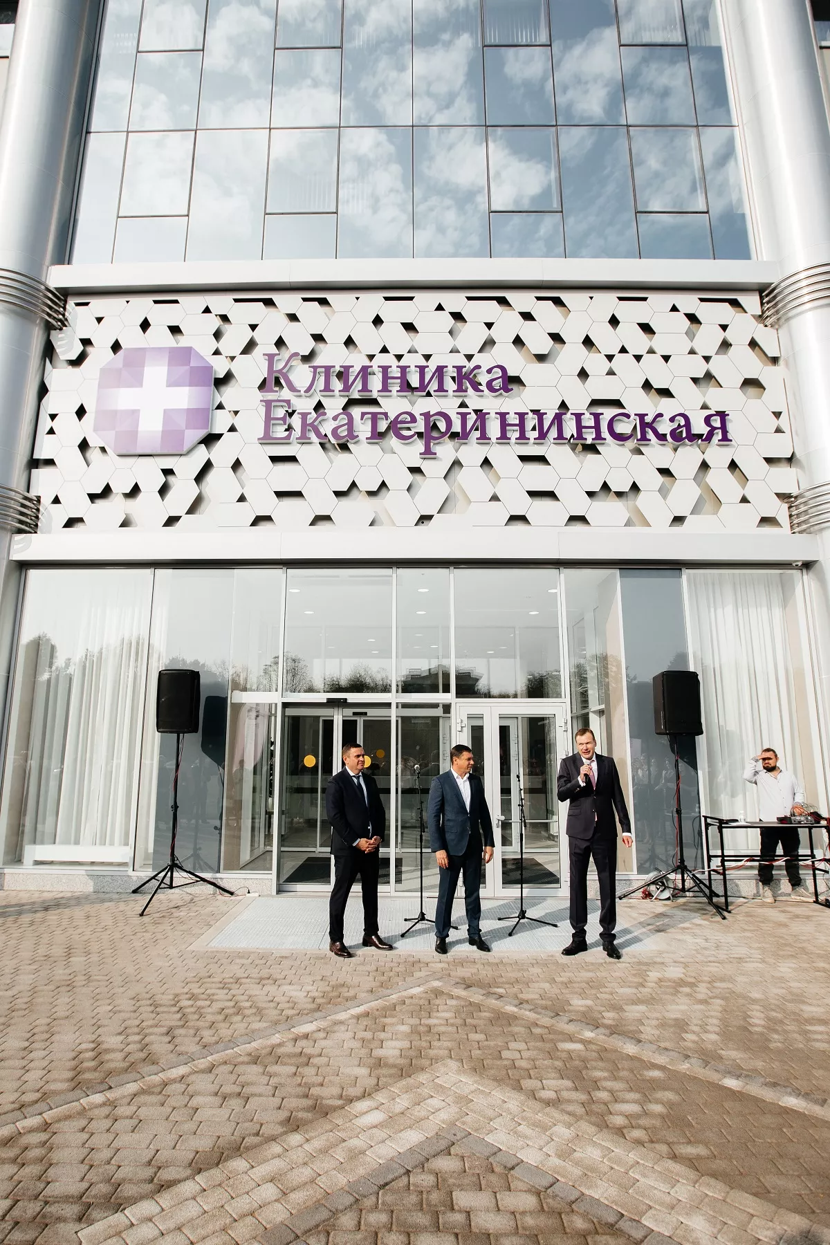 Красную ленточку на открытии перерезали генеральный директор Клиники Екатерининская Виталий Волков, мэр Краснодара Евгений Первышов и соучредитель сети клиник Алексей Прокопенко.