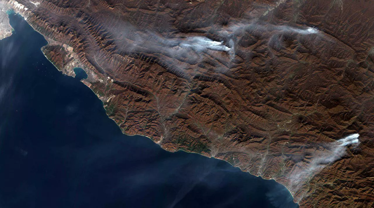Фотограф Павел Мудров опубликовал изображения системы по наблюдению за Землей Copernicus, где видны действующие пожары в Краснодарском крае