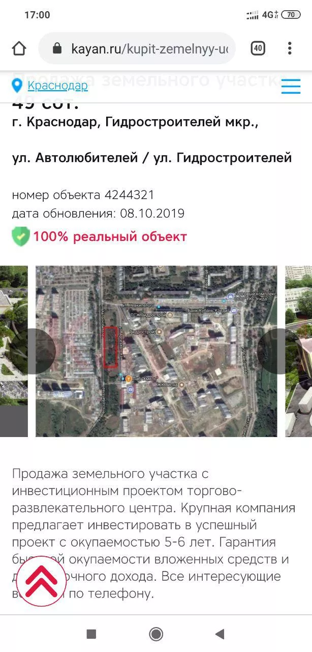 Паблик «Туподар» 24 октября в своем телеграм-канале опубликовал скриншот объявления агентства по продаже недвижимости «Каян». В нем на продажу выставили участок площадью 49 соток между улицами Автолюбителей и Артезианской в микрорайоне Гидростроителей.