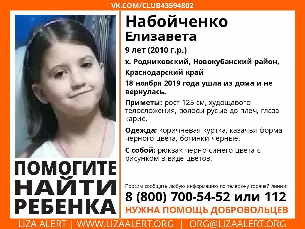 Тех, кто что-либо знает о местонахождении Елизаветы Набойченко, просят звонить по телефону: 8(928)278-93-37, 8(800)700-54-52 или 112.