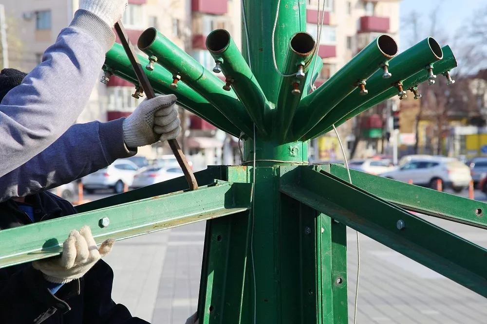 Собирать 22-метровую искусственную ель будут в течение трех недель, еще неделя потребуется на украшение дерева. На него повесят гирлянды, снежинки и шары. Все украшения будут выдержаны в серебристо-золотой гамме.