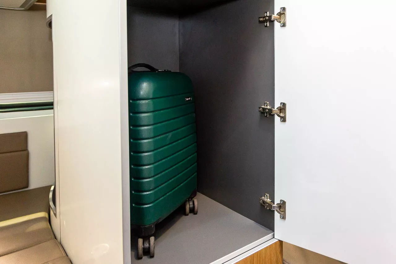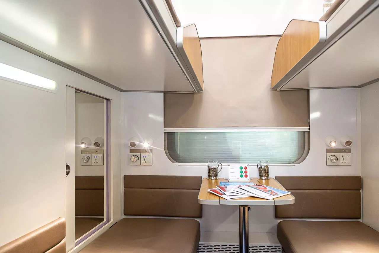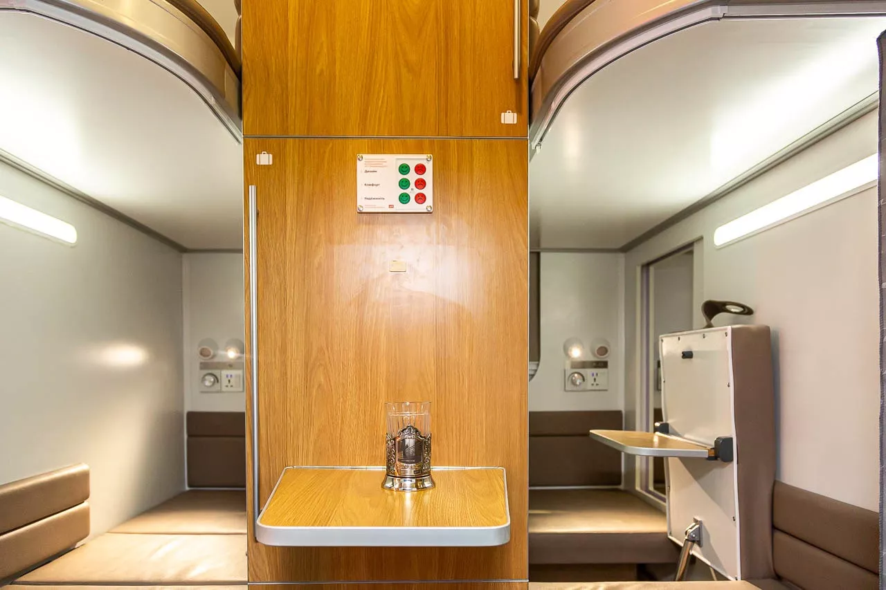 Полноразмерный макет одного из новых интерьеров «Трансмашхолдинг» представил на международном форуме «Транспорт России» 19 ноября, пишет RT. В концепте были предусмотрены перегородки, личные столики и шкафы, а сам он выполнен в светлых и бежевых тонах.