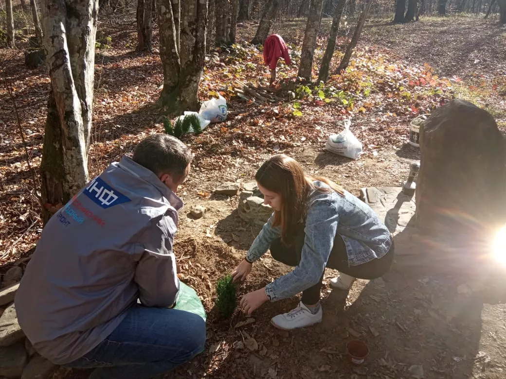 На месте базы общественники вместе со школьниками установили памятник, высадили цветы и пять кипарисов в память о пяти погибших членах отряда.