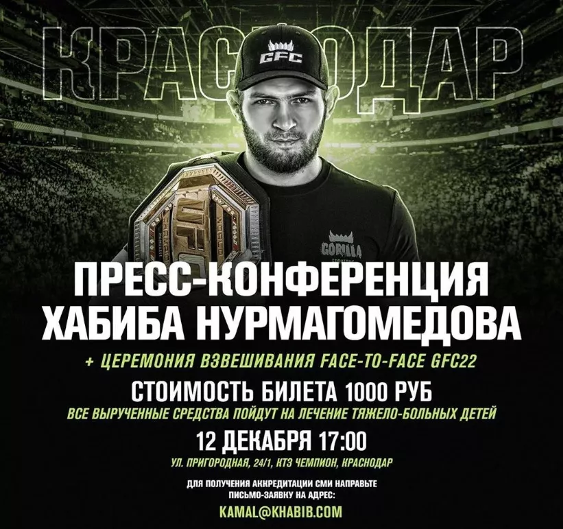 «В преддверии турнира, после церемонии взвешивания, я проведу встречу с болельщиками в формате "вопрос — ответ" в КТЗ "Чемпион". Билет на встречу будет стоить тысячу рублей. Все средства от продажи билетов мы с вами отдадим детям, которые очень сильно в них нуждаются», — написал Нурмагомедов.