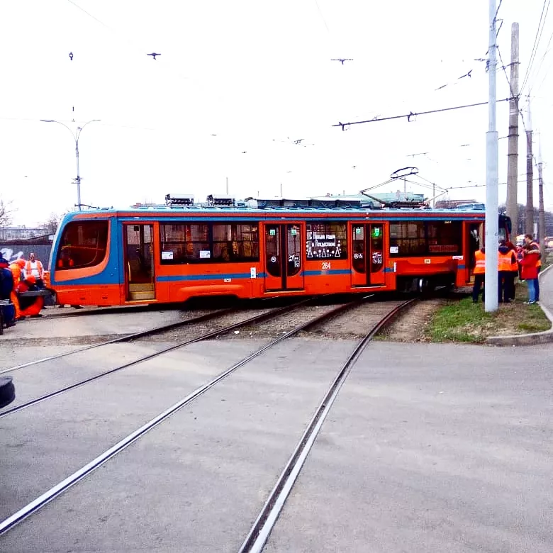 Авария произошла на кольце на пересечении улиц Колхозной и 40-летия Победы. Когда трамвай двигался задним ходом, под вагоном перевелось перо и тележки пошли вразрез.