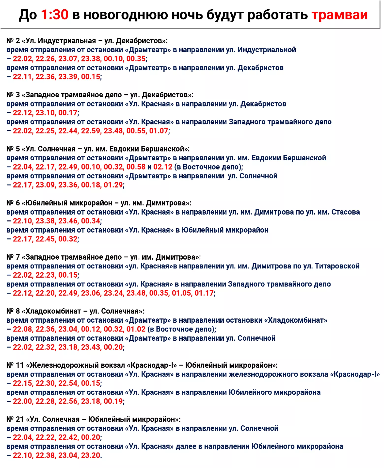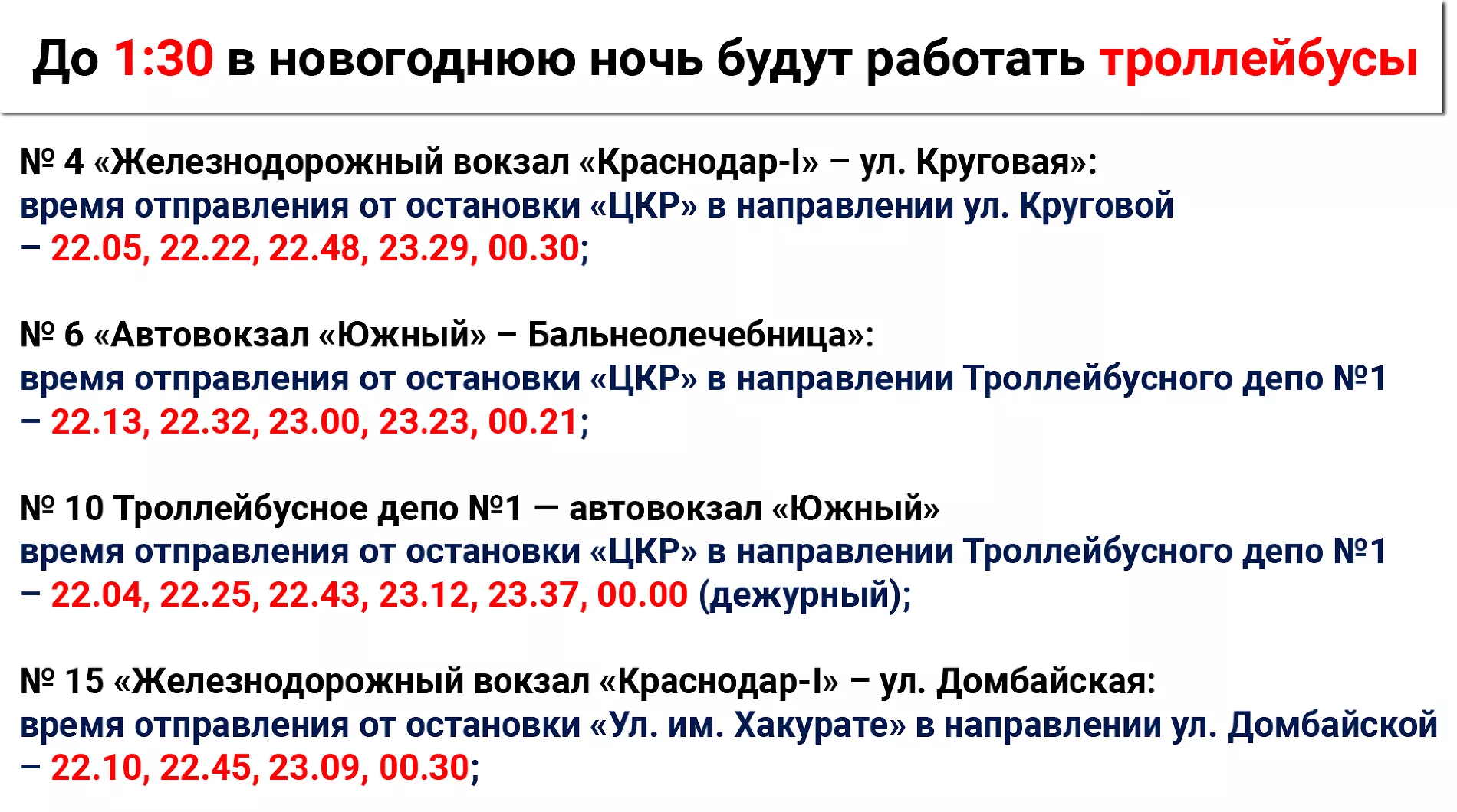 Администрация Краснодара подготовила 28 декабря расписание, по которому в новогоднюю ночь будут работать троллейбусы, трамваи, автобусы и маршрутки