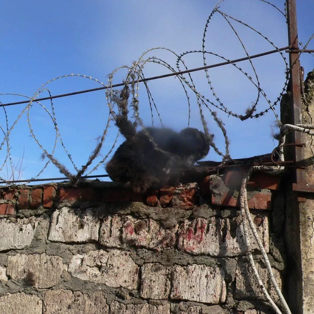 Кот запутался в колючей проволоке на заборе металлобазы. Мужчина, проживающий по соседству, услышал вопли и вызвал спасателей.