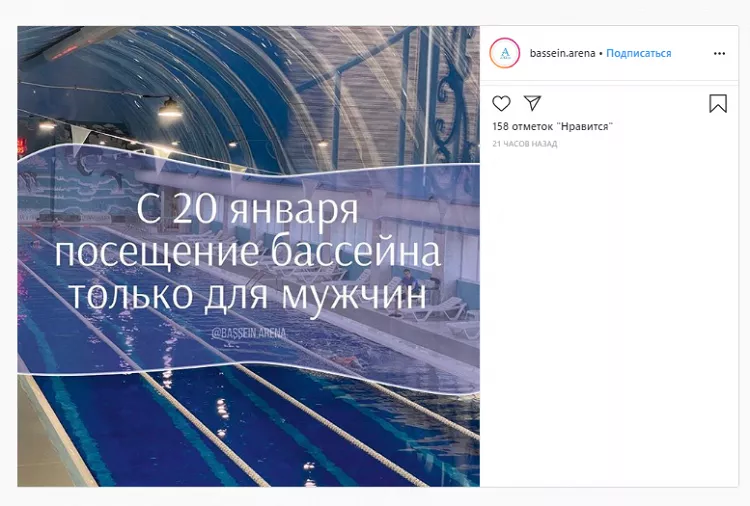 О том, что посещать бассейн в спортивно-развлекательном комплексе «Анжи Арена» в Каспийске смогут только мужчины, написала 19 января «Афиша Daily». В издании пояснили, что сообщение о закрытии бассейна для женщин появилось в официальном инстаграме бассейна, который во время написания новости сделали закрытым, но «Афиша» сделала скриншот новости.