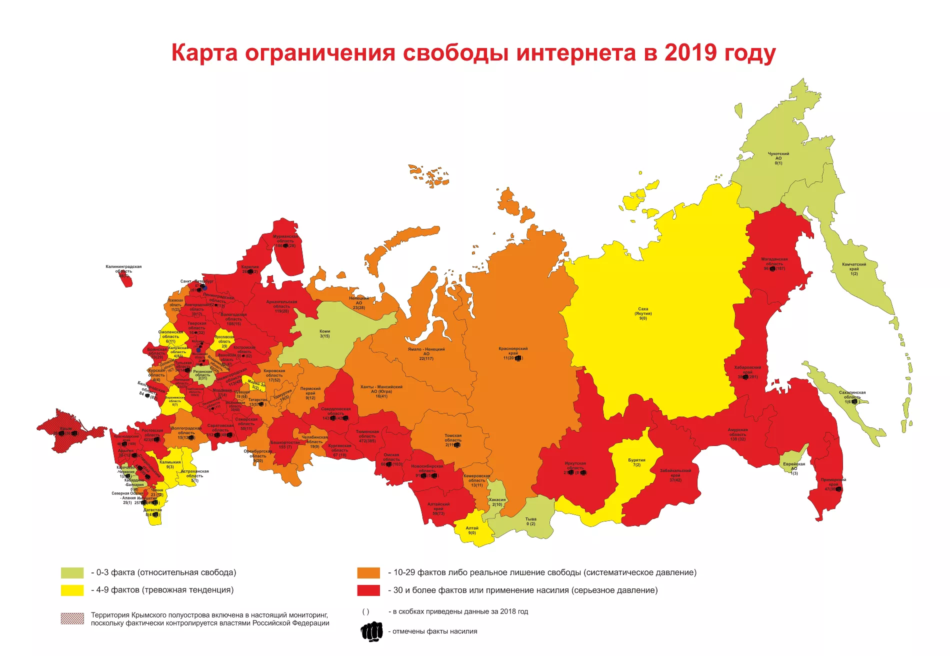 В 2019 году авторы доклада зафиксировали 438 тыс. 981 случай вмешательства в свободу интернета в России (в 2018 году — 662 тыс. 842), из которых абсолютное большинство (434 тыс. 275) связаны с ограничением доступа к интернет-сайтам и сервисам, а также запретом информации по различным основаниям.